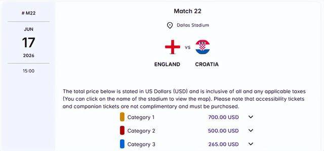 即使只看小组赛,门票定价也不低。根据FIFA官网公布的票价,英格兰队首战在美国达拉斯对阵克罗地亚,最便宜的门票也要265美元(约合1870元人民币)。