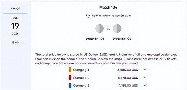 根据FIFA官网上的定价表,世界杯决赛的“经济票”起价为4185美元(约合2.95万元人民币),“标准票”为5575美元(约合3.93万元),“高端票”则为8680美元(约合6.12万元)。