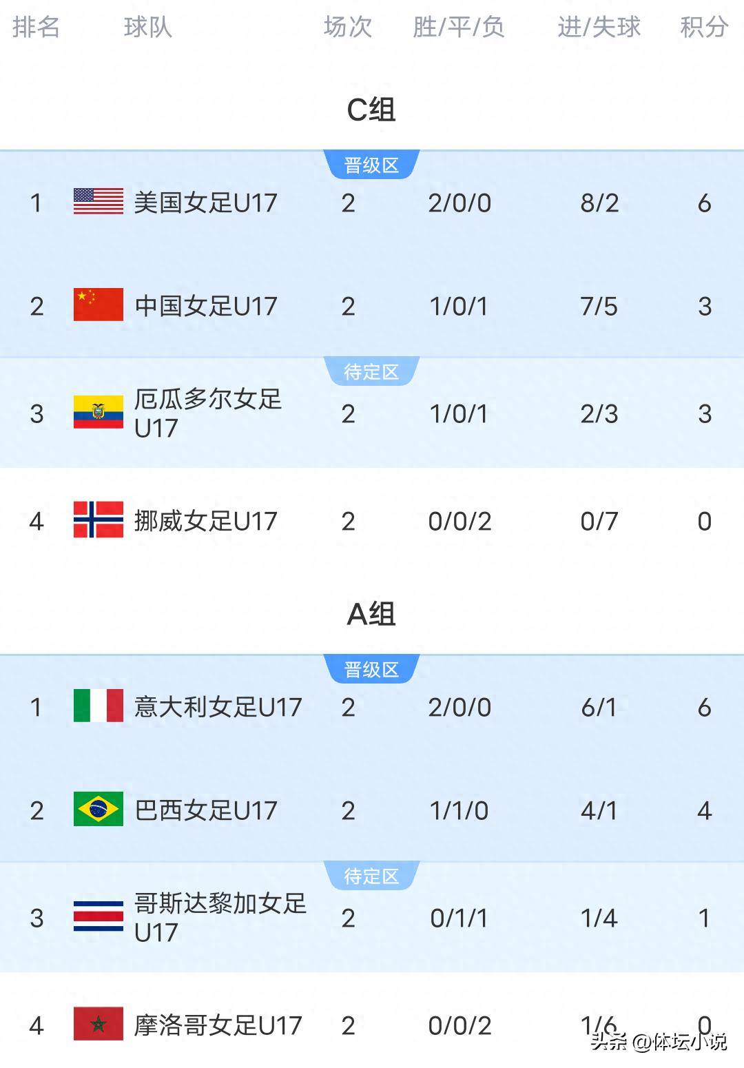 2026世界杯赛程,世界杯投注,世界杯球队阵容,世界杯预测,世界杯直播/全网最全的2026年世界杯专题报道,提供赛程时间表、球队阵容、赔率分析、投注预测与实时比分,助你掌握每一场焦点战况。北京时间10月22日,U17女足世界杯小组赛迎来了第二轮的激烈对决。经过六场精彩的比赛,比赛结果各具戏剧性。朝鲜女足以2-1战胜了喀麦隆女足,展现出强劲的实力。哥斯达黎加女足则意外地与巴西女足1-1握手言和,令人颇感意外。美国女足火力全开,最终以5-2大胜中国女足。挪威女足则以0-2不敌厄瓜多尔,荷兰女足在最后时刻被墨西哥绝杀,0-1不敌对手。作为东道主的摩洛哥女足则在比赛中完全没有发挥出优势,以1-3输给了意大利女足。最新的积分榜上,美国、意大利和朝鲜占据榜首位置,而中国女足暂时排在第二。