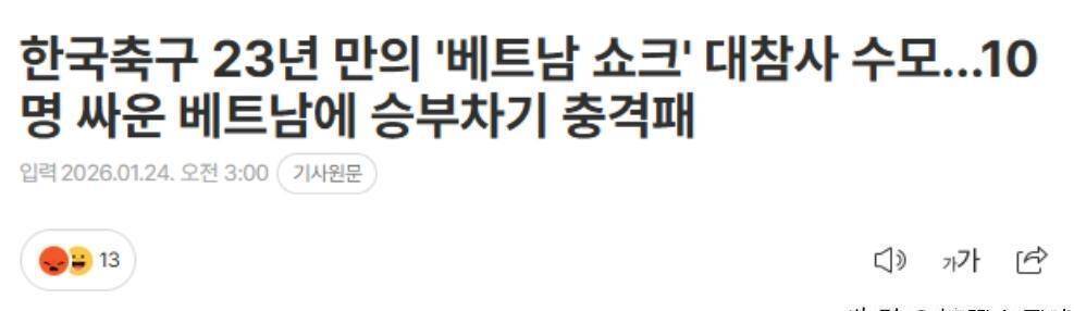 说到输给乌兹别克斯坦那场,韩国球迷早就憋了一肚子火。 那场比赛他们全场就2脚射门,进攻完全瘫痪,后防线还失误送大礼。 当时球迷就意难平,觉得球队靠运气才惊险晋级淘汰赛。 没想到,更糟的还在后头。