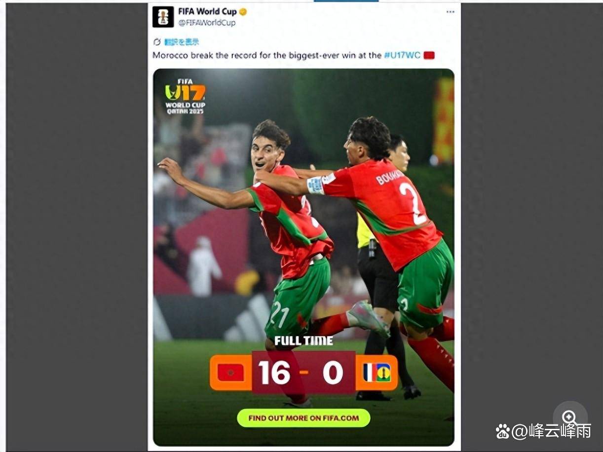 同组的另一场比赛则出现了令人震惊的比分。摩洛哥队以16-0的悬殊比分,狂胜上一轮曾与日本0-0战平的新喀里多尼亚队。此役让摩洛哥的净胜球从-8猛增至 8,排名升至小组第三,保留了出线希望。本场比赛,摩洛哥队全场记录到78次射门。尽管对手有两人被罚下,但据国际足联数据,这场16-0的胜利创造了赛会最大分差纪录。社交媒体上,这一比分引发了热议:第一次看到16-0这种比分、真是惊人的景象、日本队居然和输了16球的球队打平了。足球真是难以预测、简直是怪物一样的比分。