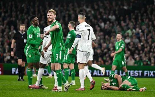 然而,嘘声如期而至,而他在比赛中的一次肘击行为更是让他陷入尴尬境地——C罗在一次争抢落点的过程中对爱尔兰的球员进行了一次肘击动作,随后还朝对手做出了哭泣的手势。然而不久之后主裁判到场边回看了这一事件的录像,最终直接将C罗红牌罚下。